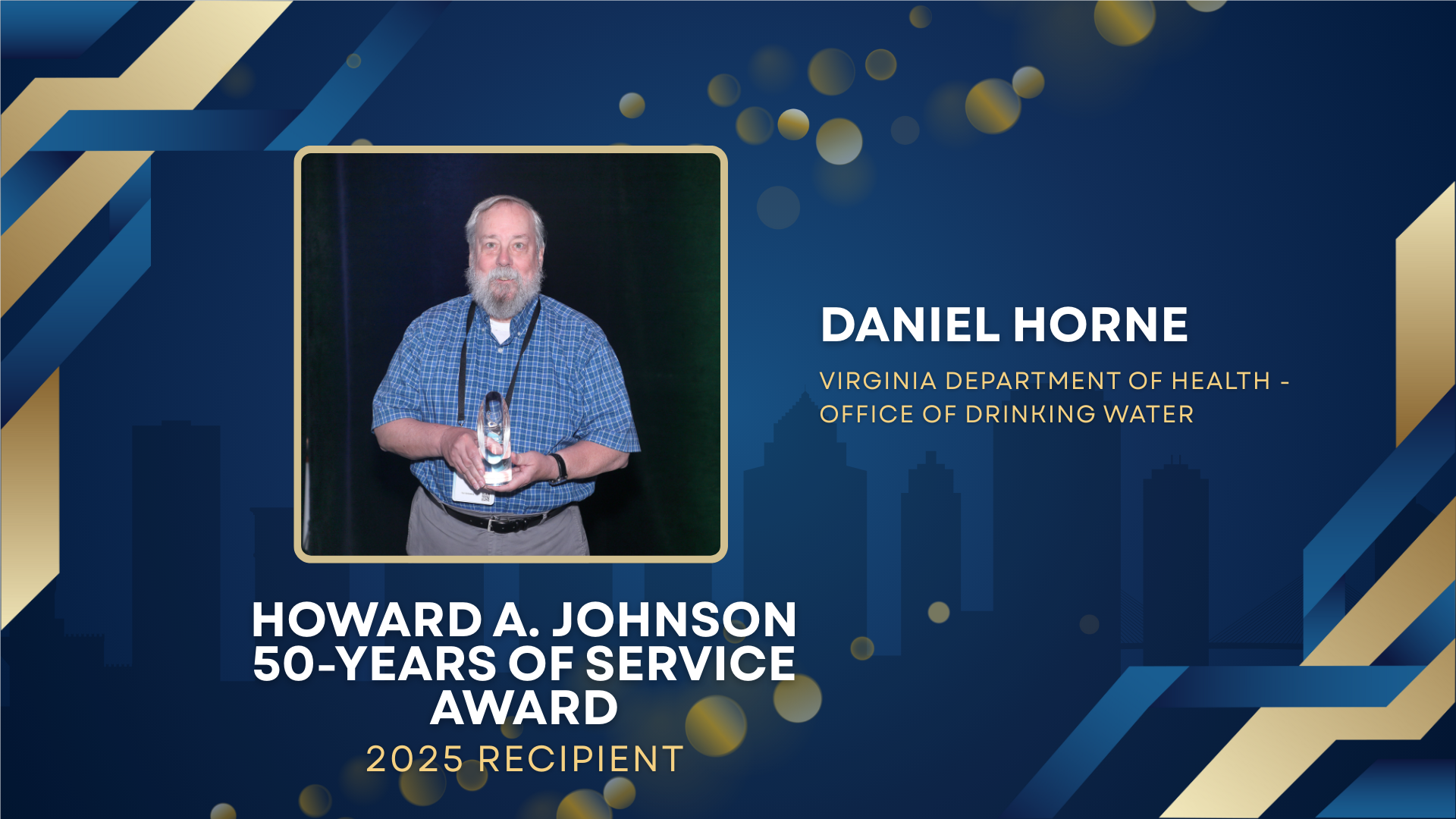 The Howard A. Johnson Award is bestowed upon individuals who have completed 50 years of membership in VA AWWA. The Nominations Committee will determine the recipient based on years of membership.